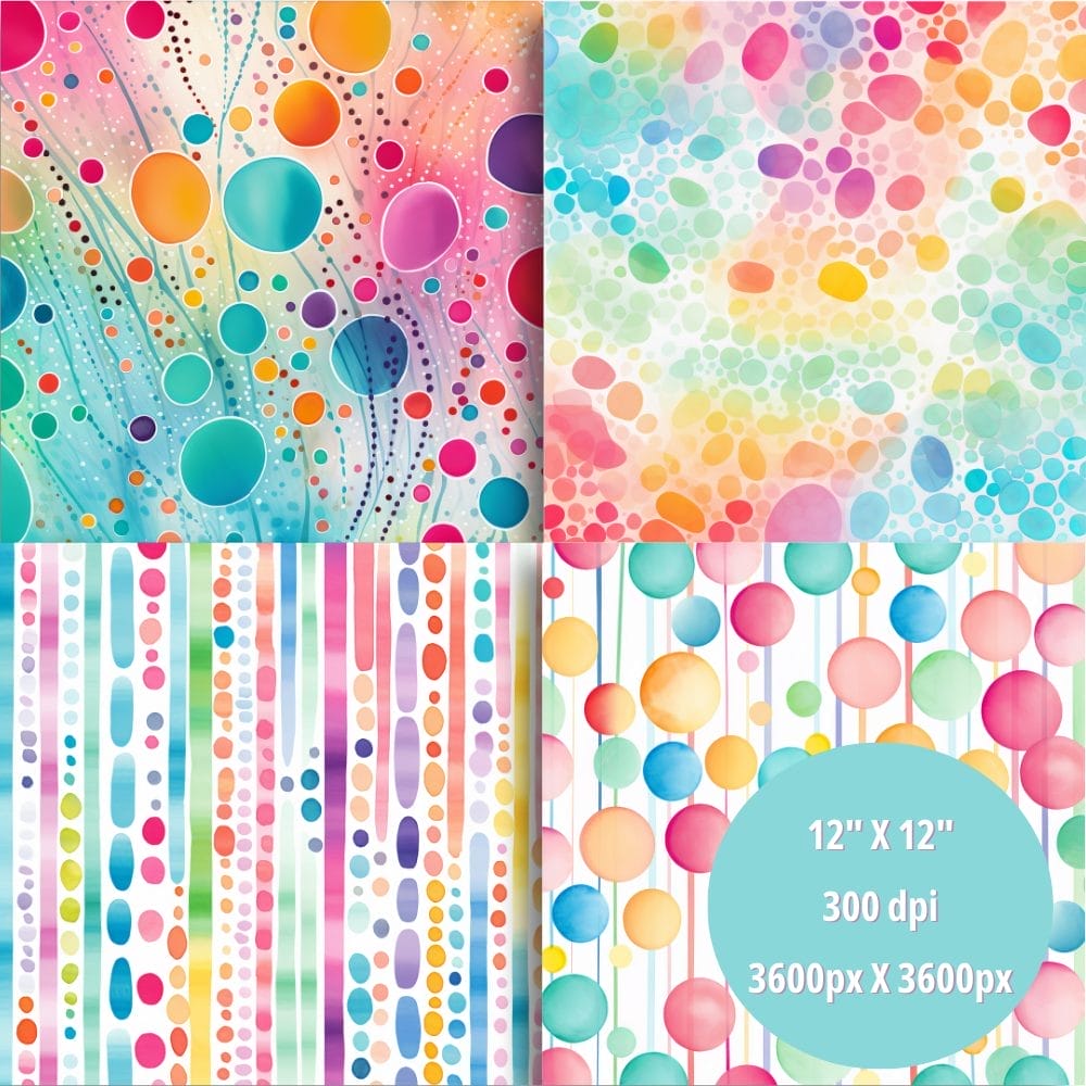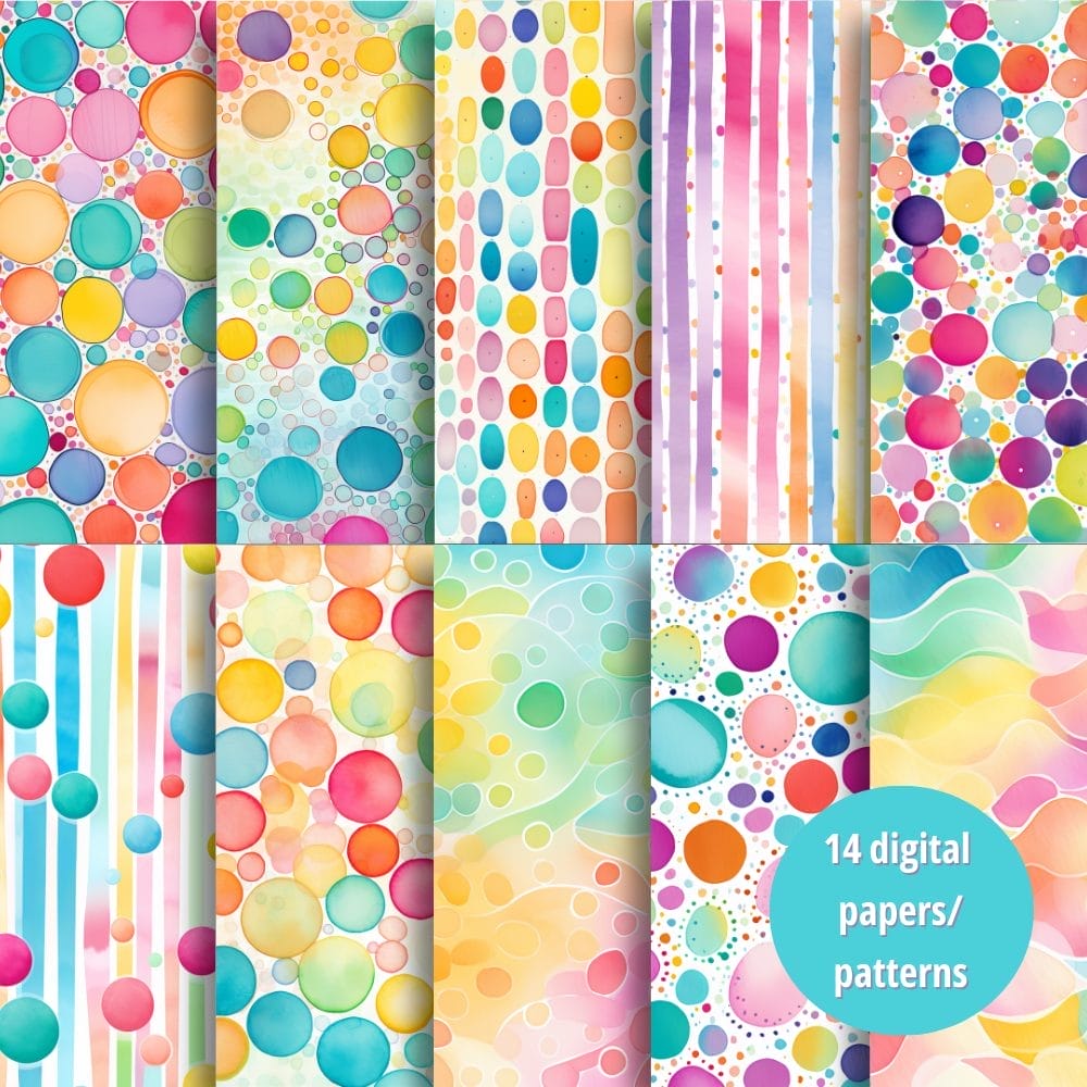 - 14 Watercolor Brights Digital Papers: Stunning abstract patterns featuring circles, dots, and stripes in a rainbow of cheerful hues.