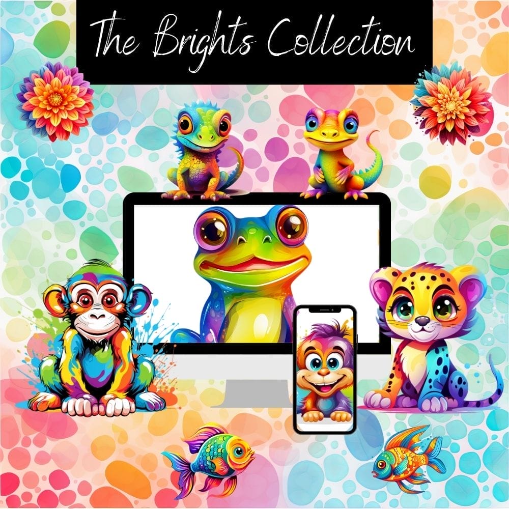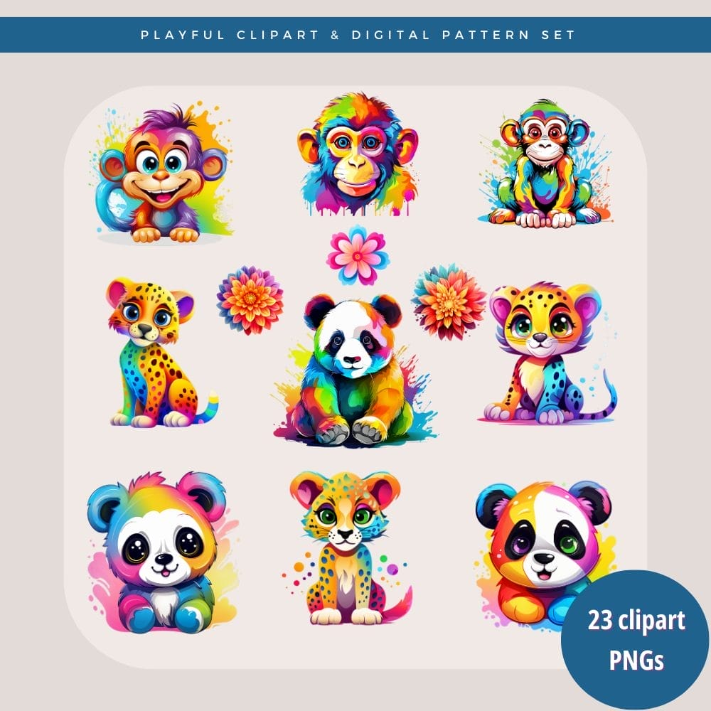 - 23 Wild Brights Clipart PNGs: Adorable, colorful animal characters including monkeys, pandas, cheetahs, and more, perfect for adding playful charm to your designs.