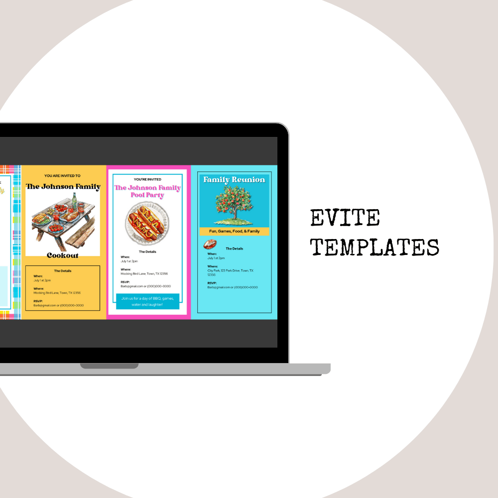 Complete outdoor celebration package with clipart, e-vites, social media templates, certificates, and activities. Easily customizable for cookouts and family reunions. Ideal for resale and PLR opportunities.